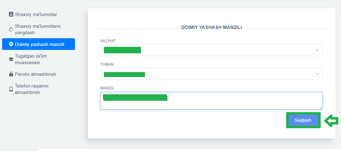 keyingi oynada menyudan doimiy yashash manzili tugmasi bosiladi va doimiy yashash manzili kiritiladi va saqlash tugmasi bosiladi
