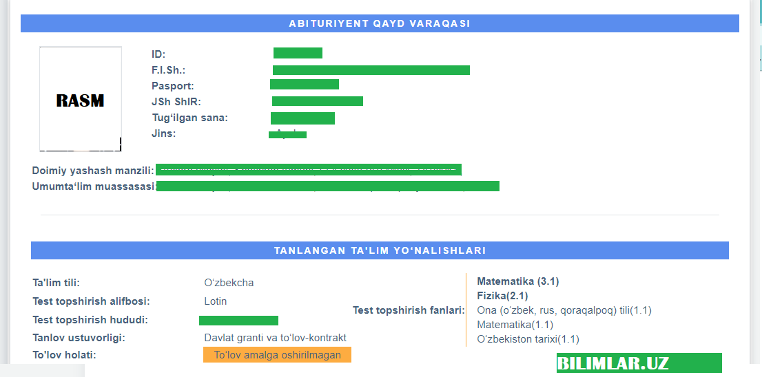 ABITURIYENT QAYD VARAQASI abituriyentni pasport ma’lumotlari, TANLANGAN TA’LIM YO‘NALISHLARI, To’lov holati To‘lov amalga oshirilmagan oshirilgan, IMTIYOZLAR bor yoki yo’qligi, ABITURIYENTGA ESLATMAlar berilgan bo’ladi, Agarda abituriyentda imtiyoz mavjud bo’lsa su yerda ham aks etadi.