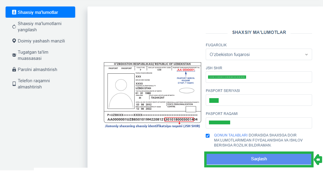Shundan so’ng Oliy ta’lim muassasalarining bakalavriatiga qabul (2023-2024-o‘quv yili uchun) tugmasi bosiladi. Keyingi qadamda esa pasport ma’lumotlari kiritish oynasi ochiladi, abituriyentning shaxsiy identifikatsiya raqami pasport yoki ID seriyasi va raqami kiritiladi va so’ngra shaxsiy ma’lumotlaridan foydalanishga rozilik bildirilib saqlash tugmasi bosiladi.