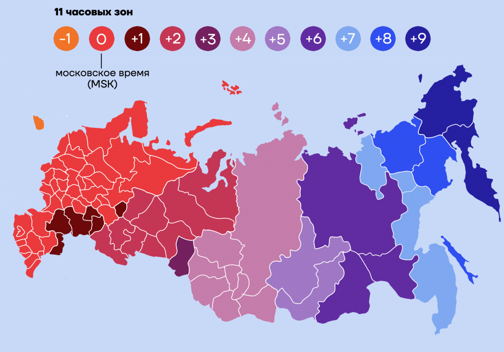 Согласно закону, принятому в 2014 году, в России насчитывается одиннадцать часовых зон, растянувшихся от Калининграда до Камчатки, разница во времени между которыми составляет десять часов. То есть когда в Калининградской области десять утра, на Камчатке восемь часов вечера. Одним из самых значительных изменений в этом законе стала отмена перехода на летнее время.