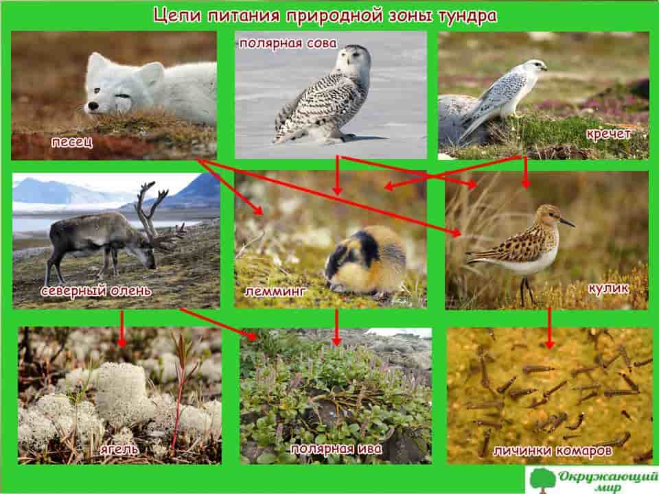 5) Расскажите по этому рисунку об экологических связях в тундре. Изготовьте модель цепи питания, характерной для тундры.