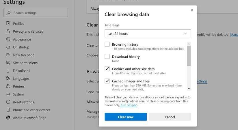 - Проверьте Файлы cookie и данные сайта и Кэшированный веб-контент вариант.