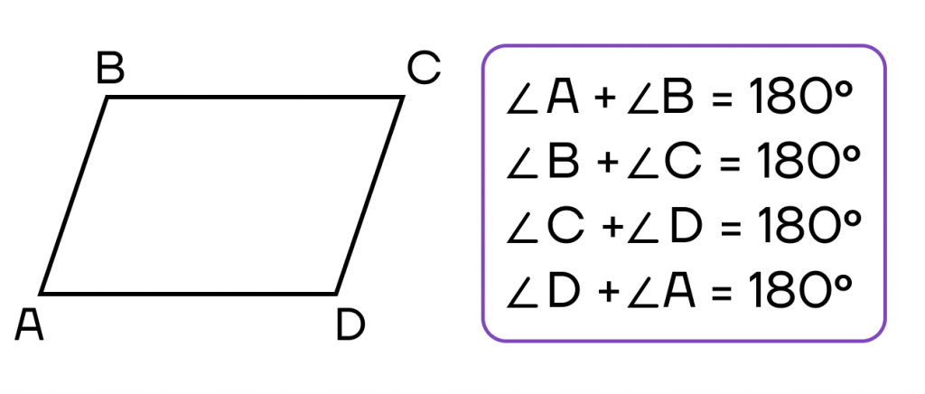 - Сумма углов, прилежащих к любой стороне, равна 180.