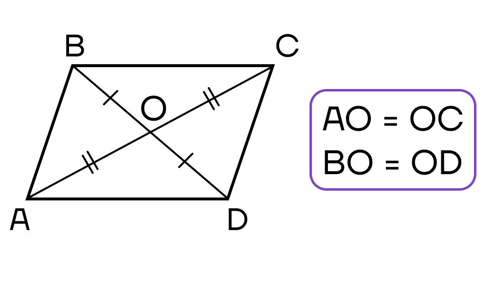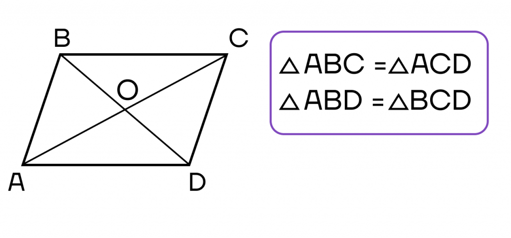 - Диагонали делят параллелограмм на четыре треугольника с одинаковой площадью.
