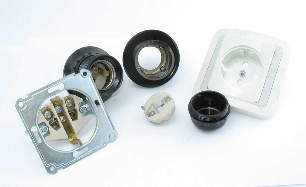Держатели ламелей розетки, патрона изготовлены из фарфора. Чёрный корпус патронов — карболит.