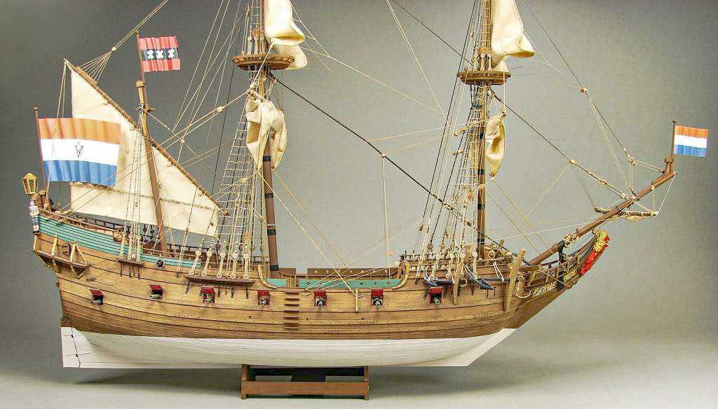 Еще одни вид парусных судов – пинасс. Судно очень напоминает флейт, но с небольшими отличиями в конструкции бортов. Носовая часть судна заканчивалась прямоугольной переборкой от палубы до полубака. Длина пинасса составляла больше сорока метров. Это трехмачтовое судно водоизмещением до всего лишь до 800 тонн преимущественно использовалось для перевозки людей или торговли. Пинасс применялся в качестве канонерской лодки или посыльного. Позже небольшие парусные пинасы обеспечивали сообщение между линейными судами, для введения флота в гавань, подхвата почтовых отправлений и т.д.