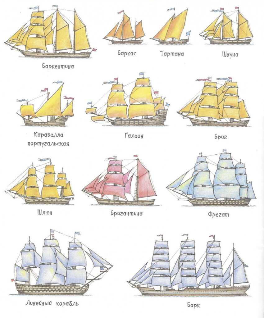 Разделение — условно, так как возможны сочетания прямых и косых парусов у всех типов.