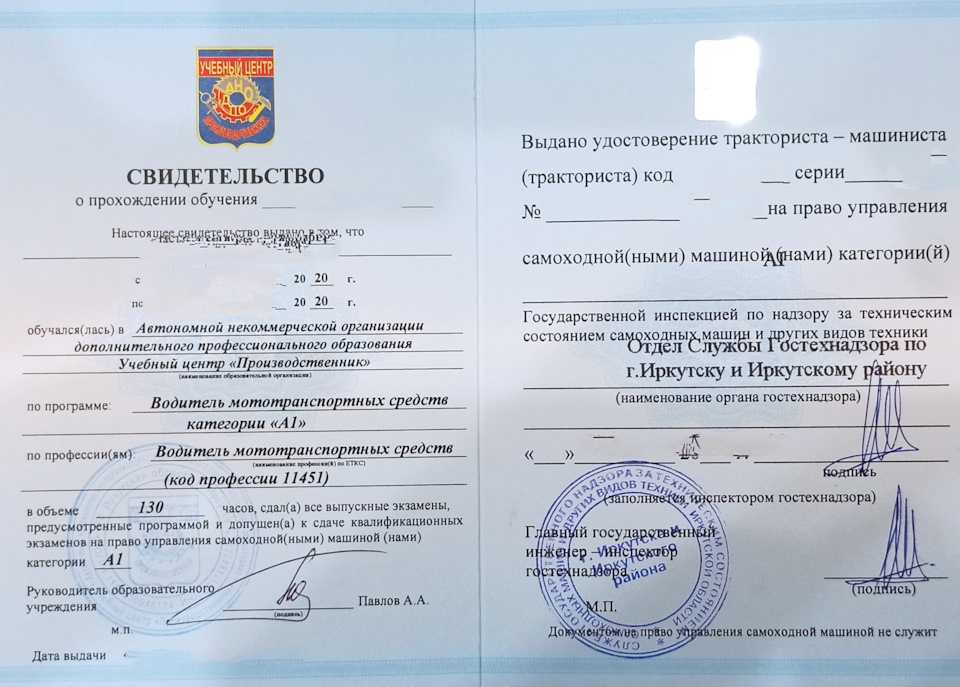 Кстати, в Гостехнадзоре в Свидетельстве об обучении делают запись о выдаче Удостоверения тракториста-машиниста