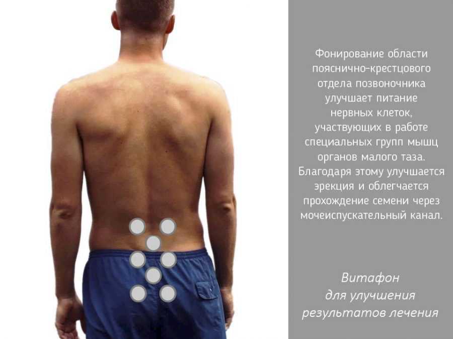 Мужчина занимает лежачее положение на спине. В районе поясницы нужно положить тоненькую салфеточку, а сверху датчики Витафон. После проведения манипуляции представителю сильного пола необходим покой, лучше укрыться одеялом и полежать минимум час. Данное время потребуется, чтобы кровообращение и лимфоток в районе предстательной железы оставались такими же, как и во время проведения лечебных процедур.