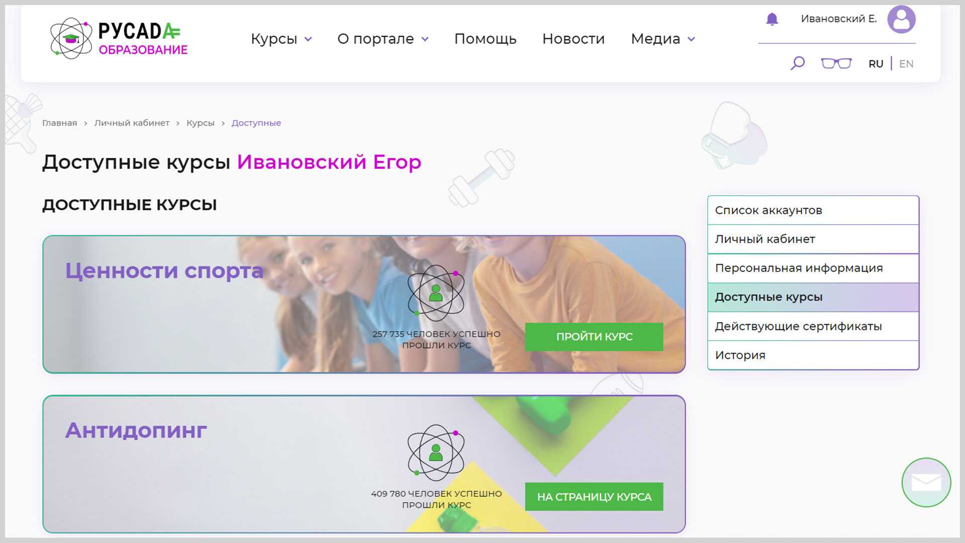 Для взрослых спортсменов в начале 2023 года предложен курс «Антидопинг», а для детей в возрасте до 14 лет ещё и курс «Ценности спорта». Причём для детей «Антидопинг» доступен только после прохождения курса «Ценности спорта».