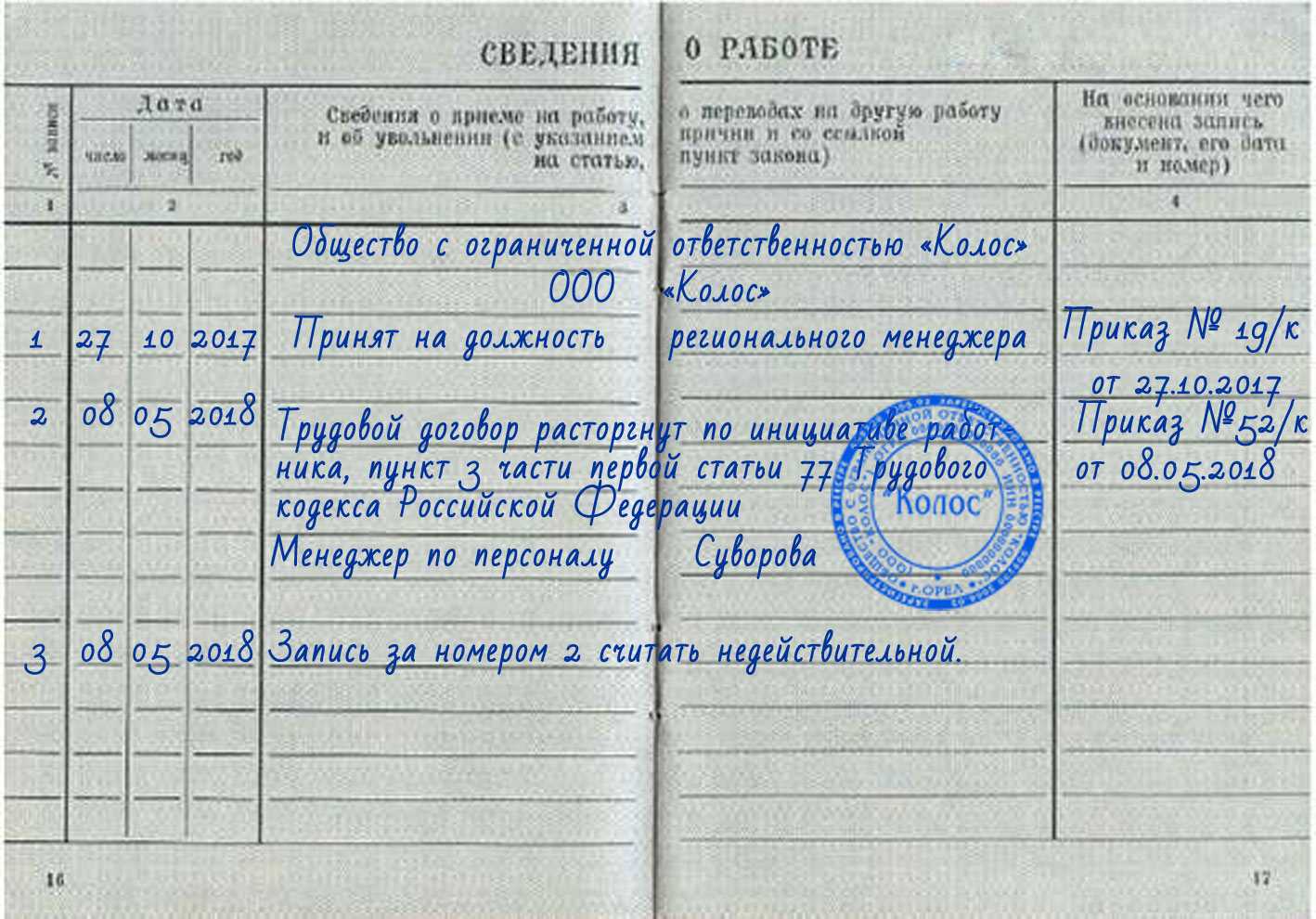 Стоит понимать, делая запись о приёме на работу, в бумагу вносится информация, действующая на тот момент. Если внесённая информация в дальнейшем требует корректировок или при её написании сделана описка, запрещено её перечёркивать. После такой отметки ставится новая, о том, что запись под определённым номером будет признана недействительной.