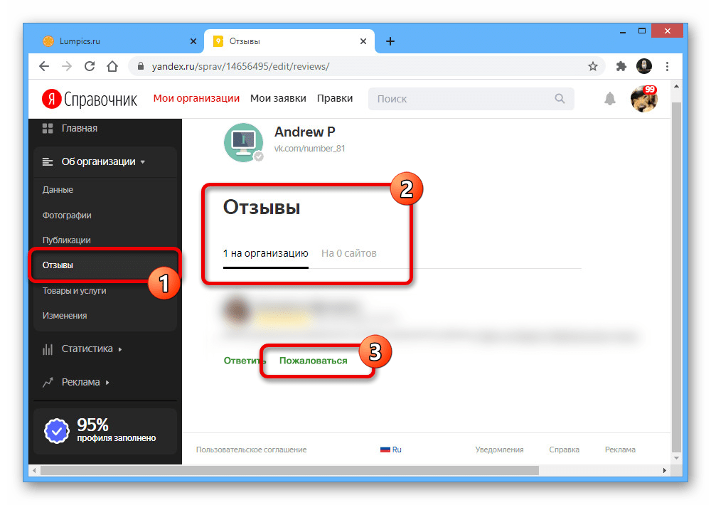 Если вы, будучи владельцем организации на Яндексе или своего сайта, хотите удалить чужой проверенный отзыв, к сожалению, в настоящее время выполнить данную задачу напрямую не получится. В таком случае единственное, что можно предпринять, это оставить жалобу с помощью соответствующей опции, доступной в разделе «Отзывы» в панели управления.