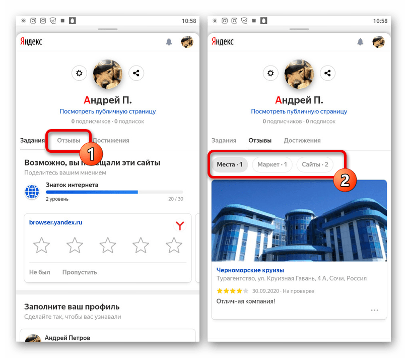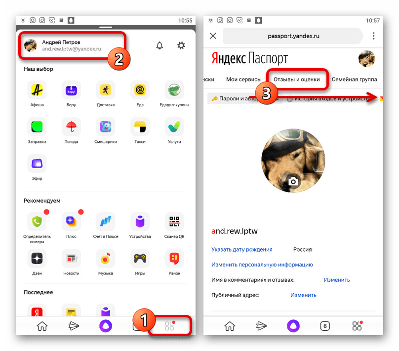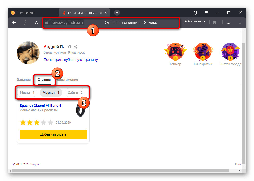 - Воспользуйтесь представленной выше ссылкой или верхней панелью Яндекс.Паспорта, чтобы открыть страницу «Отзывы и оценки» в любом удобном браузере. Здесь необходимо переключиться на одноименную вкладку и с помощью дополнительного меню выбрать одну из категорий.