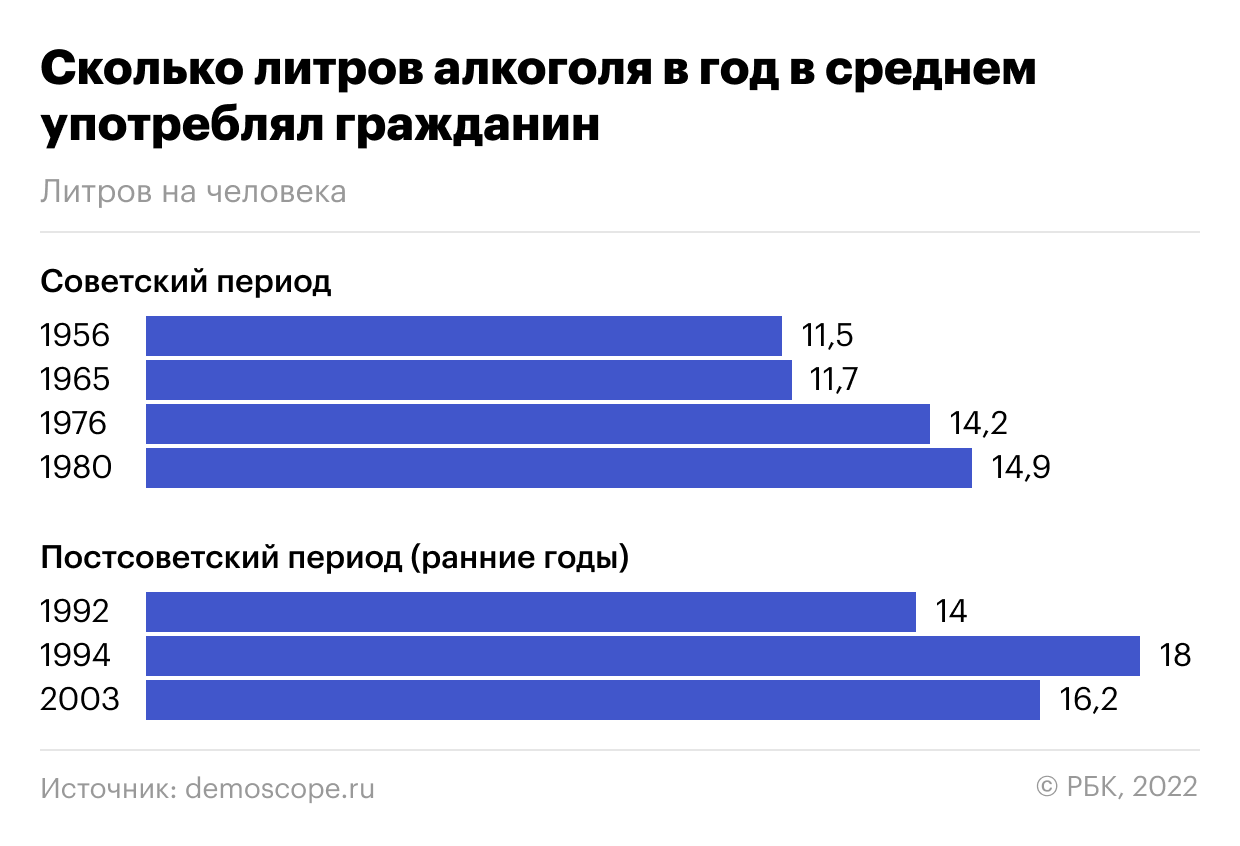 Позже, в период застоя, советские власти стали усиливать «борьбу с пьянством», так как несмотря на предыдущие антиалкогольные мероприятия, потребление алкоголя неуклонно росло. Если в 1960-е годы рядовой советский человек употреблял примерно 11,7 литров алкоголя в год, то в эпоху застоя цифра выросла — до 14,2 литров. К началу 1980-х показатель и вовсе достиг 14,9 литров. Ранний постсоветский период также принес вспышку роста потребления алкоголя, в 1994-м году количество потребленного алкоголя на человека достигло 18 литров.