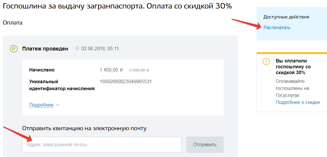 После оплаты в личный кабинет придёт уведомление о проведении платежа. Квитанцию необходимо распечатать для предъявления в ведомстве. Для этого воспользуйтесь кнопкой «Распечатать». Также квитанцию, при необходимости, можно отправить на электронную почту.