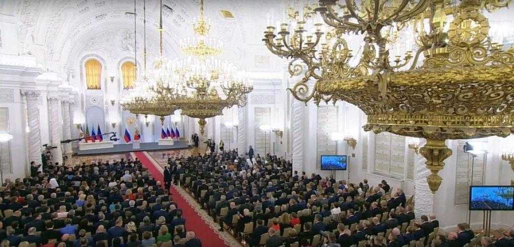 30 сентября 2022 года в Георгиевском зале Кремля в Москве Президент Российской Федерации Владимир Путин провел Помимо обращения к государству, оно транслировалось по федеральным телеканалам и проходило в прямом эфире, наряду с подписанием договора о вхождении ЛНР, ДНР, Херсонской и Запорожской областей (частично подконтрольных частей) в состав России. Согласно результатам, началось присоединение четырех новых регионов (субъектов федерации) с населением более 8 000 000 человек. По предварительным данным, вместе с Республикой Крым они образуют новый Крымский федеральный округ.