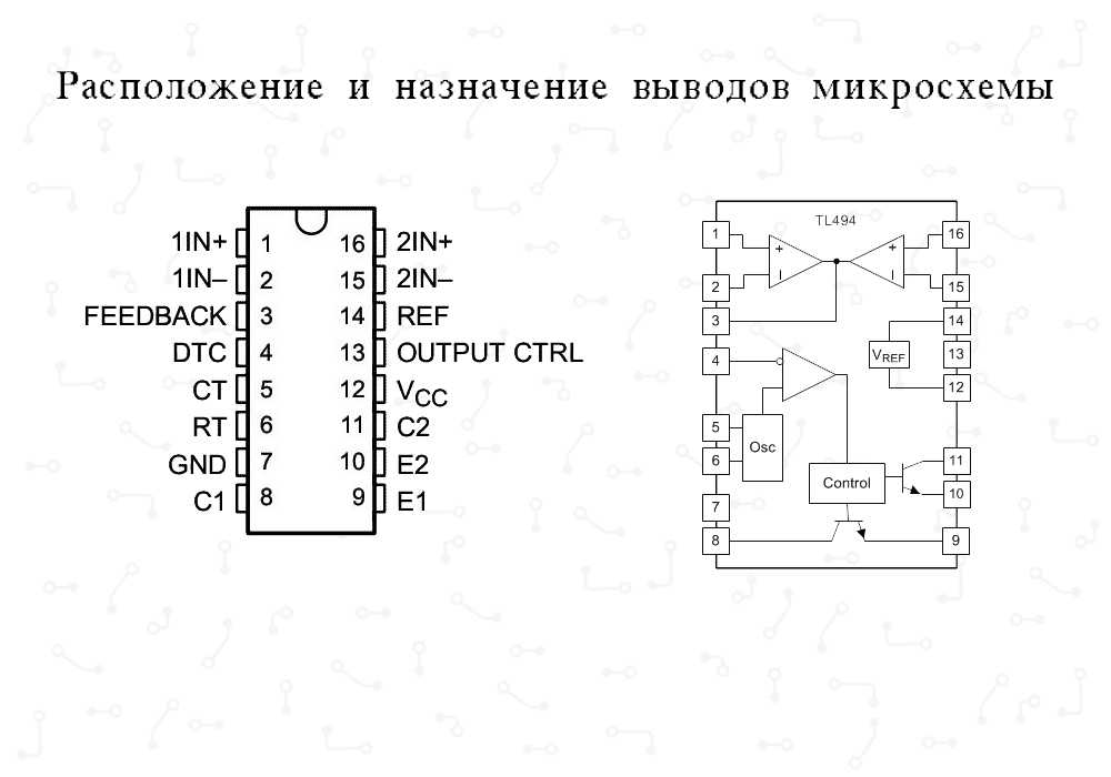 Как и любое другое электронное устройство. рассматриваемая микросхема имеет свои входы и выходы. Мы начнем с первых. Выше уже было дан перечень этих выводов TL494CN. Описание на русском языке их функционального назначения будет далее приведено с подробными пояснениями.