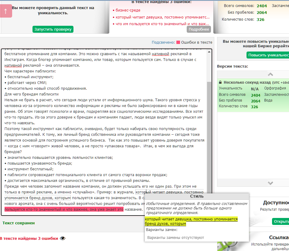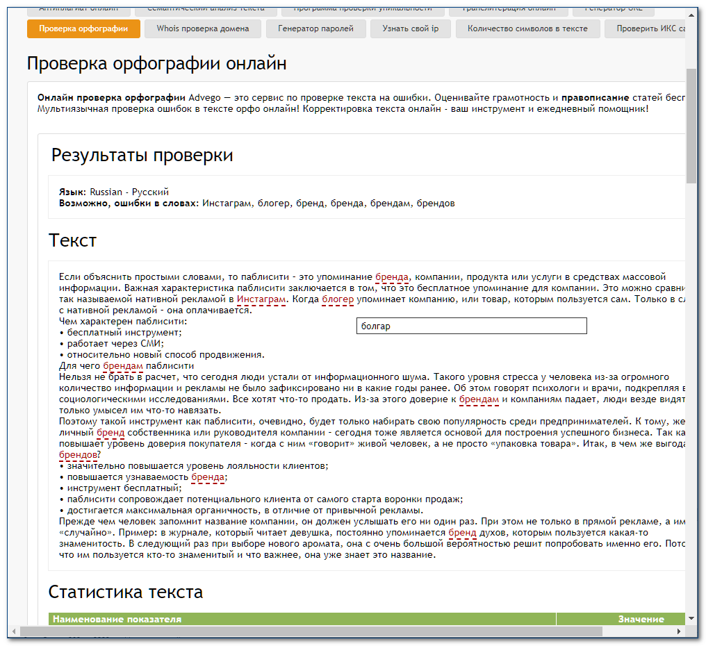 Однако, как и многие другие аналогичные сервисы Advego имеет недочеты в работе. Так, например, этот сервис не распознает такие слова как «блогер», «Инстаграм», «бренд». Хотя эти слова в обиходе уже не один год.