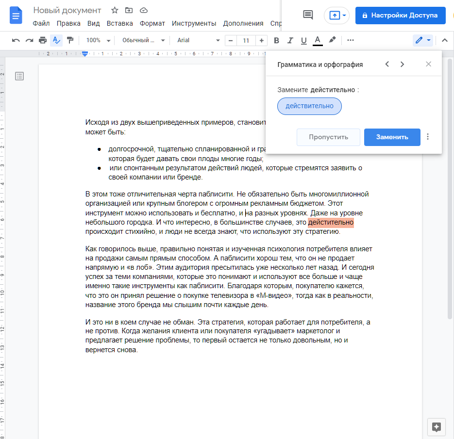 Автоматически, как это происходит в Word, орфография не проверяется. Однако достаточно нажать на кнопку «Проверка орфографии» в левом верхнем углу, и система проверит текст на ошибки, подсветит их, и предложит варианты более корректного написания.