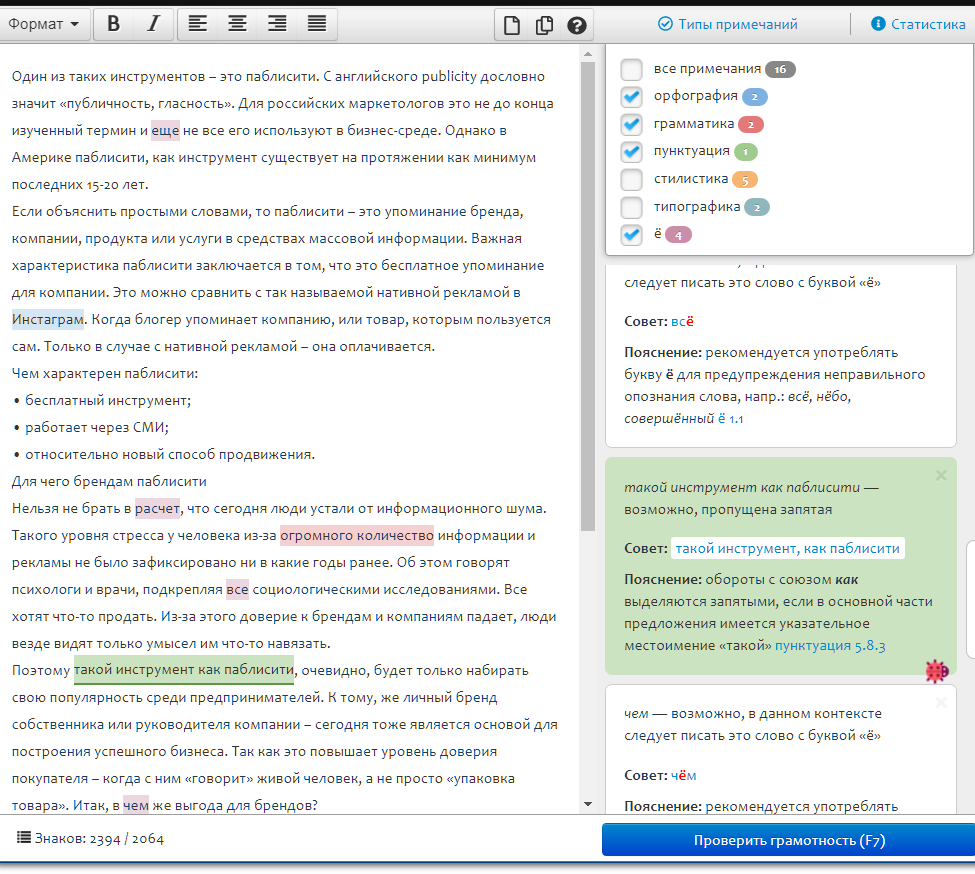 Однако, даже те, кто не использовал Text.ru как биржу фриланса, достаточно часто пользуются ее встроенным сервисом проверки орфографии. С его помощью можно обнаружить: