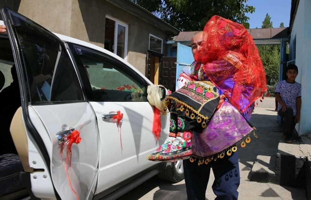 По традиции родственник невесты со стороны матери на руках выносит девушку из родительского дома / Пётр Троценко / rus.azattyq.org