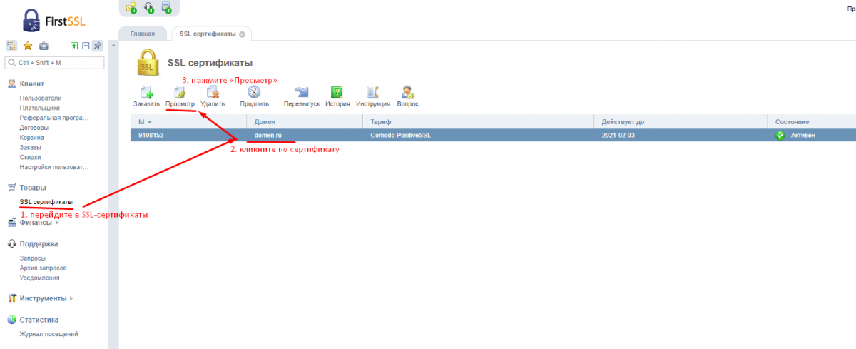 Чтобы скачать файлы в Личном кабинете, перейдите в раздел Товары — SSL-сертификаты. Кликните по приобретенному сертификату и нажмите «Просмотр»: