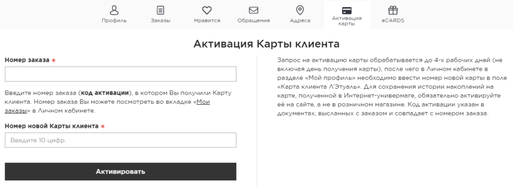 В разделе «Активация карты» вы сможете активировать свою бонусную карточку. Для этого введите номер заказа, в котором вы получили карту клиента и ее номер.