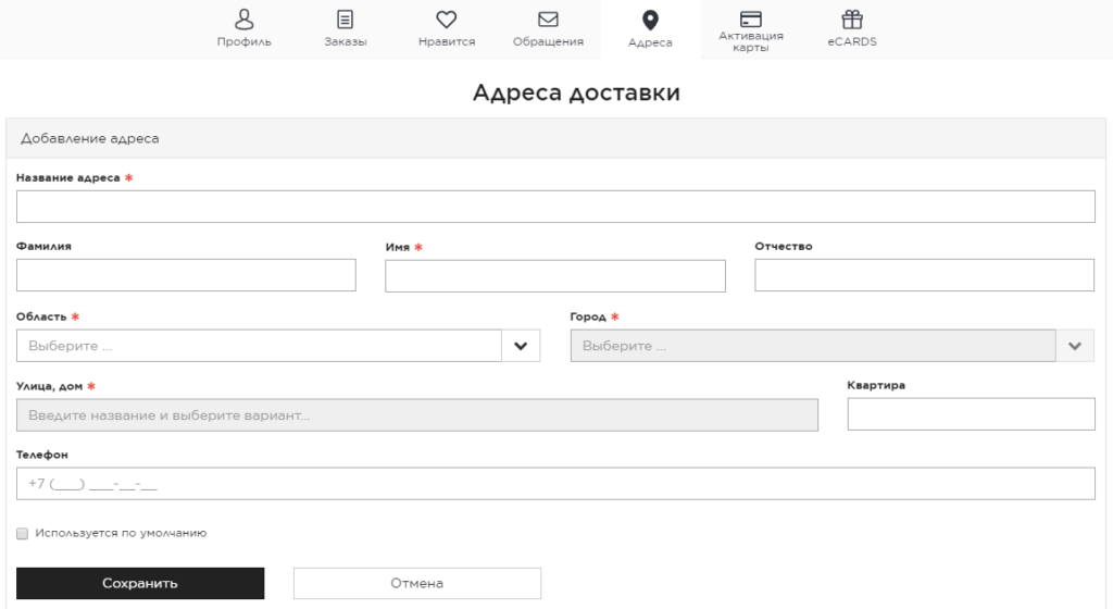 Чтобы добавить новый адрес для курьерской доставки, выберите пункт «Адреса» и заполните появившуюся форму, указав: