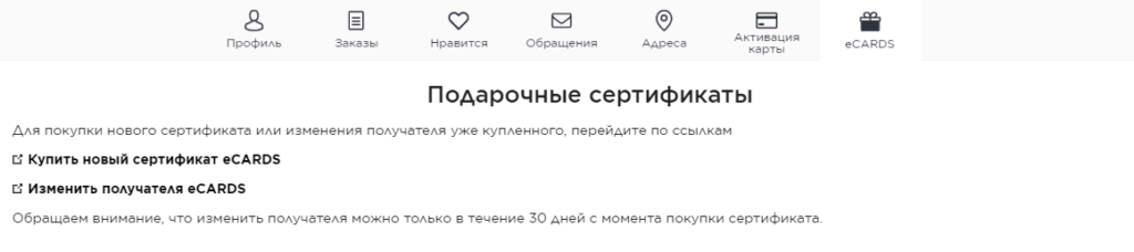 В разделе «eCARDS» вы сможете купить подарочный сертификат либо изменить получателя.
