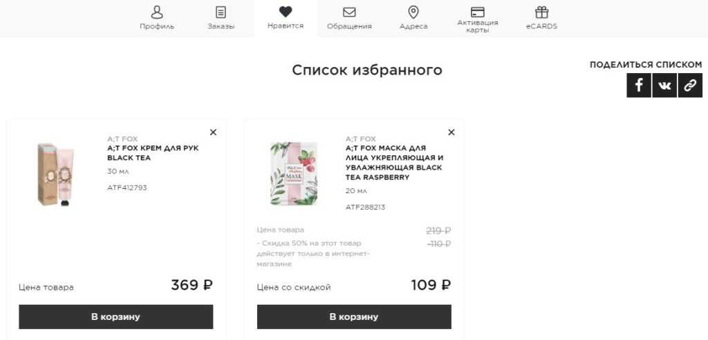 Здесь вы сможете добавлять косметику и парфюмению в «Корзину», а также делиться списком в соцсетях или с помощью ссылки.