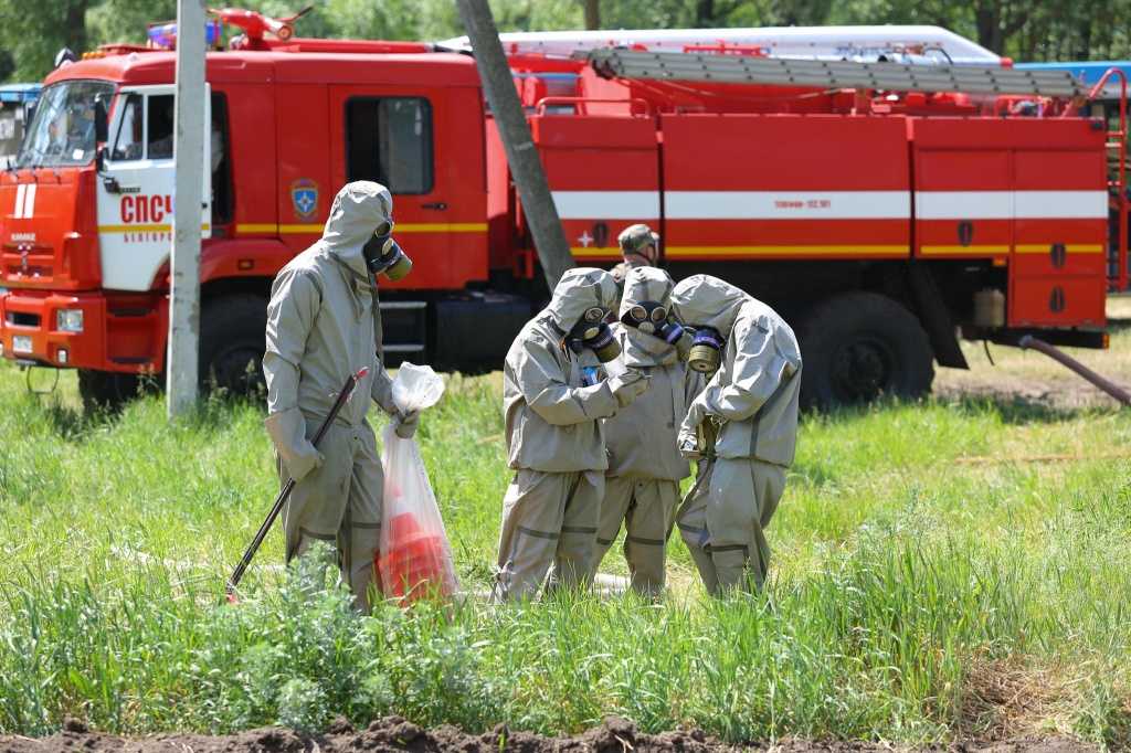спасательный отряд МЧС локализует и осаждает вредный аэрозольный выброс в открытом пространстве.