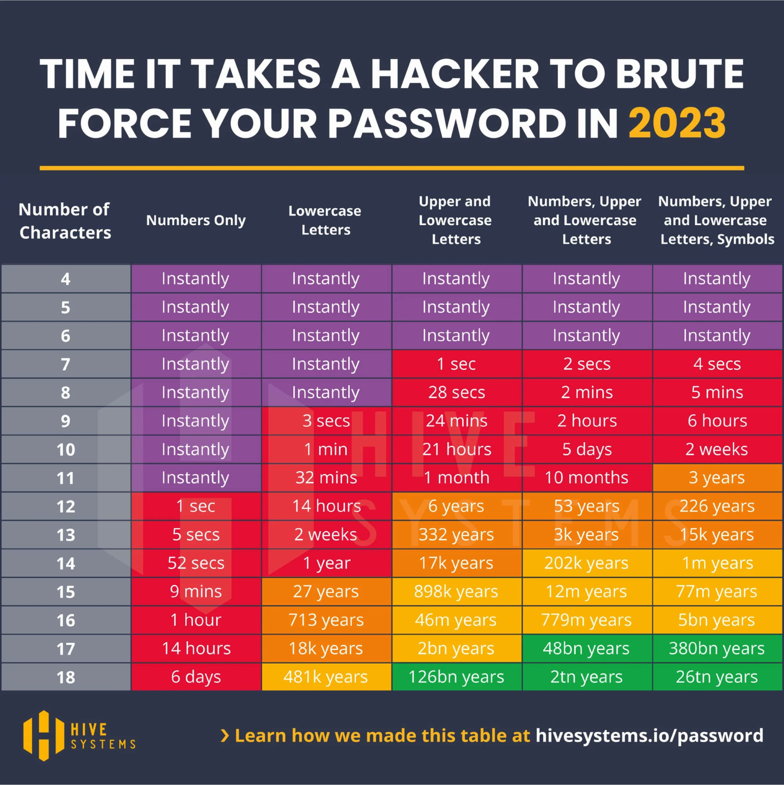 Лучший способ защититься от брутфорса — использовать надёжные пароли. Компания по кибербезопасности Hive Systems ежегодно составляет таблицу времени, нужного на взлом паролей разной сложности.