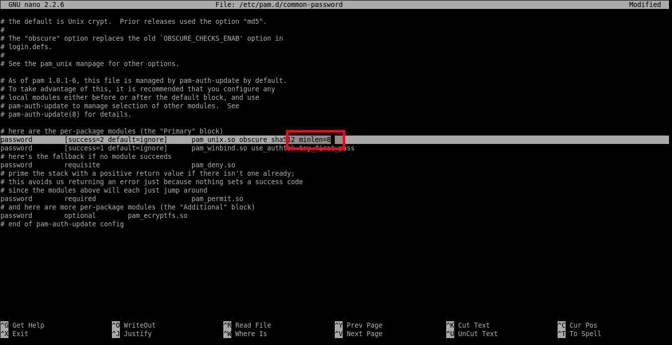 Чтобы установить минимальную длину пароля, отредактируйте файл /etc/pam.d/common-password:
