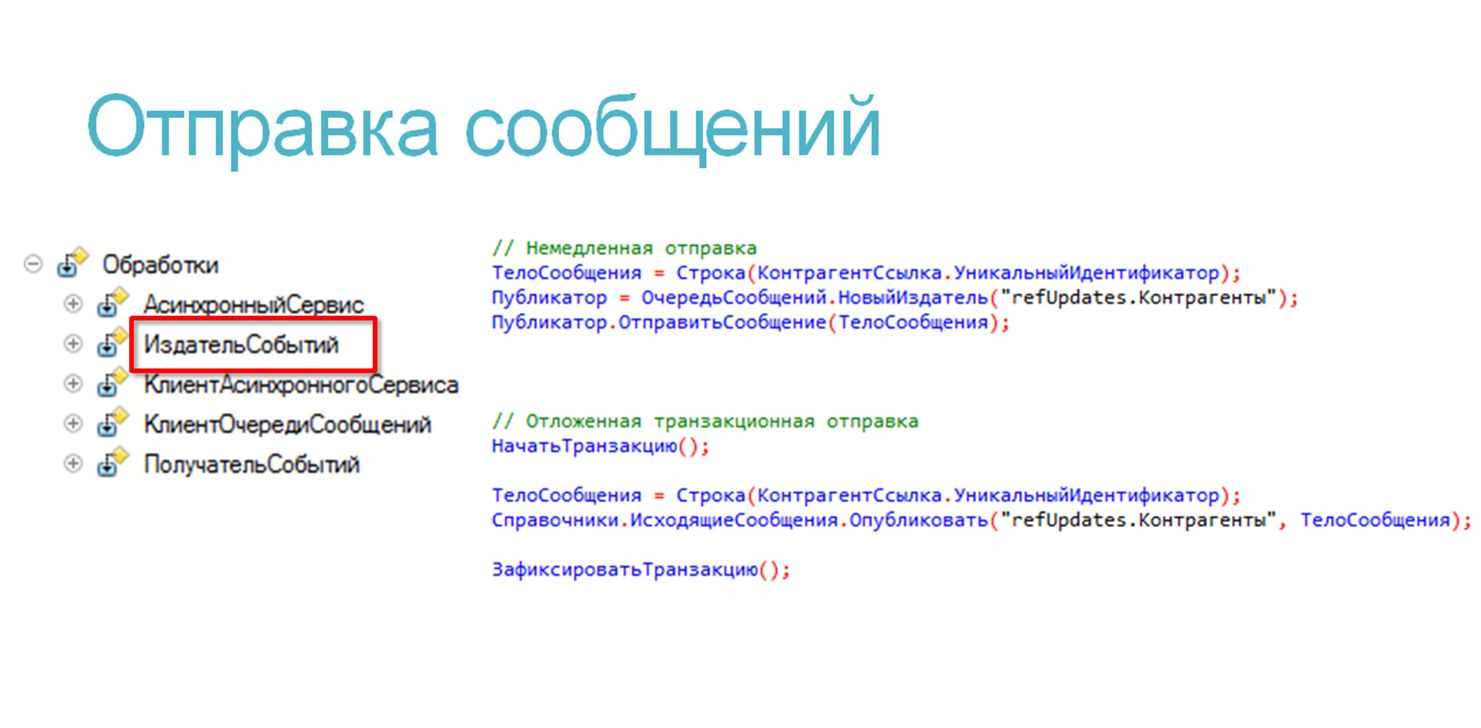 - Или наоборот, если вы хотите использовать отправку, основанную на механизме транзакций (если вдруг документ не провелся, то событие в очередь не класть), то для этого в подсистеме предусмотрен механизм отложенной транзакционной отправки (когда вы событие записываете не сразу в очередь, а сначала в справочник). В этом случае события из справочника будут отправлены «в мир» только если транзакция уже зафиксировалась.