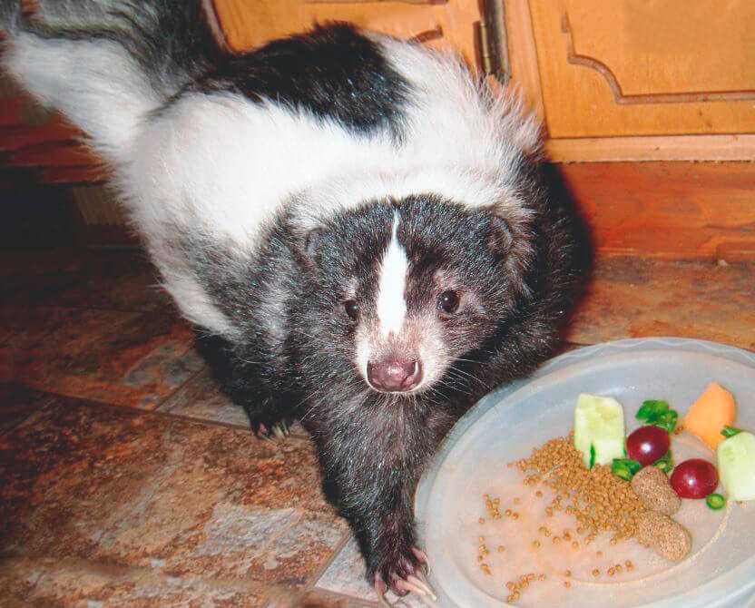 После удаления параанальных желез скунс напоминает крупную собаку. Хотя отчасти это правда – они относятся к подотряду псообразных, скунса можно приучить к лотку, или даже к выгулу на улицу. Они достаточно сообразительны, откликаются на кличку, могут выучить несколько элементарных команд. Во время брачного периода, весной, немного агрессивны. Хотя есть мнение, что они агрессивны всегда, но это в том случае, если вы купили уже взрослое, дикое животное, и скунс попросту обороняется.