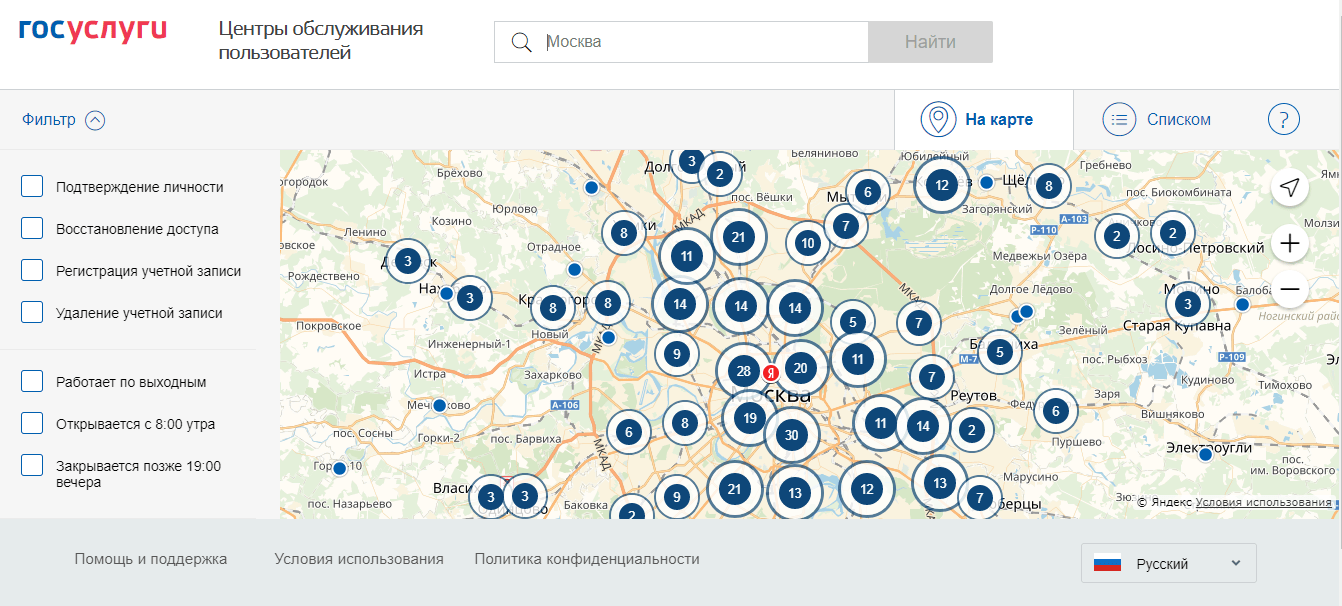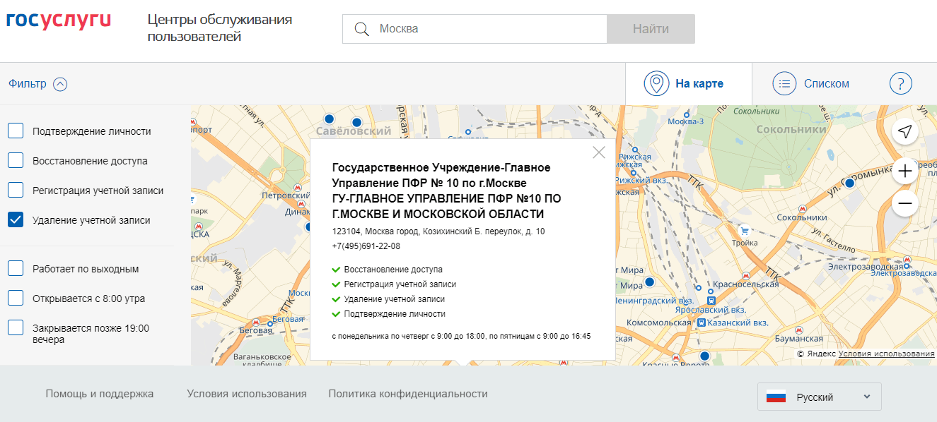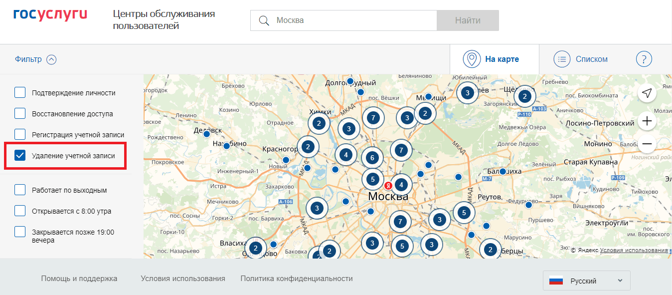 . Дайте задание найти только те центры обслуживания, где можно удалить учётную запись. Слева для этого есть фильтр. Поставьте «галочку» слева от карты. Это четвёртая сверху строка. Можете выбрать дополнительные фильтры – определить центры, работающие по выходным, рано утром или поздно вечером.