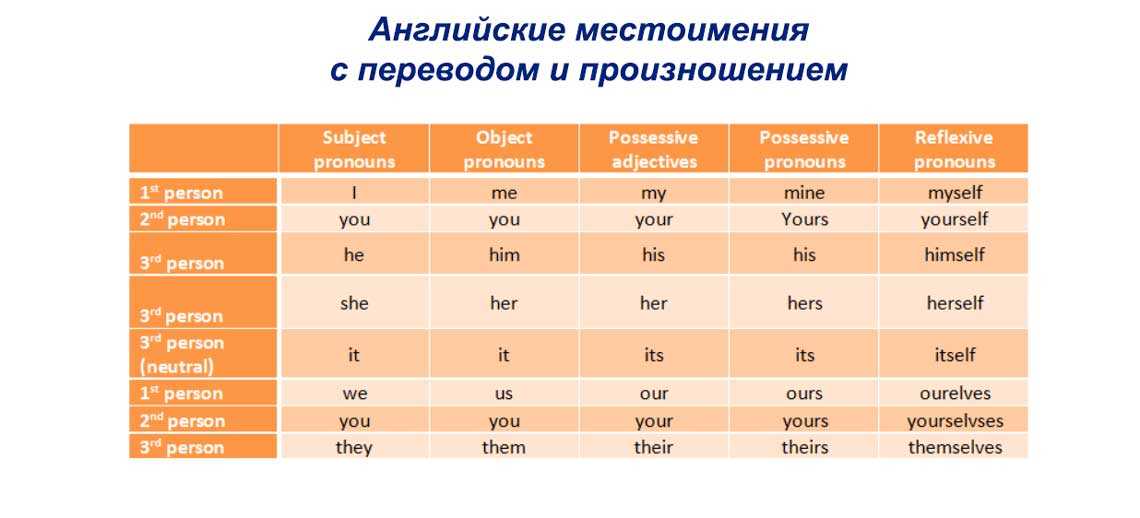 Важно знать! Перечисленные местоимения также могут употребляться в объектном падеже: Me, You, Him, Her, It, Us, Them. Вот сводная таблица личных и притяжательных местоимений: