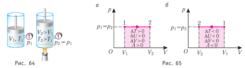 Пусть газ находится в цилиндрическом сосуде, закрытом поршнем, который может свободно или под постоянной нагрузкой перемещаться (рис. 64). Нагреем газ, передав ему некоторое количество теплоты (Q > 0). Согласно первому закону термодинамики (11.2) переданное газу количество теплоты частично расходуется на увеличение внутренней энергии ) системы и частично идёт на совершение работы силой давления газа при его расширении (A>0)(рис. 65, a):
