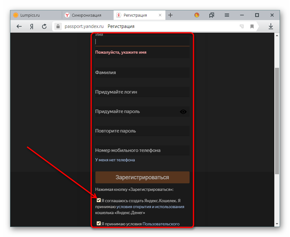 Обратите внимание, что при регистрации автоматически создается Яндекс.Кошелек. Если он вам не нужен, снимите галочку