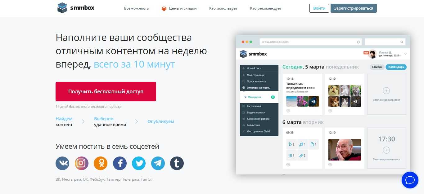 Это сервис, который знает, как привлечь подписчиков в Инстаграм. Он многофункциональный и удобный, способен заполнить все аккаунты в разных соцсетях контентом на несколько недель вперёд. Причём на это не уйдут дни и часы – всего 10-15 минут и работа будет выполнена. Есть тестовый период – 2 недели, когда вы сможете опробовать и оценить сервис, на своём опыте ощутить, насколько удобно пользоваться автоматизацией процесса.