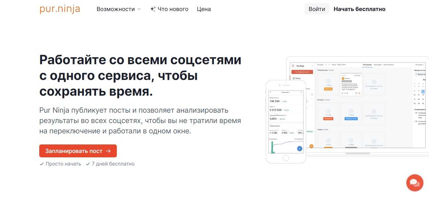 Это ещё один онлайн сервис для автоматизации работы Инстаграм и других соцсетей. Он умеет публиковать контент по заданному графику, занимается аналитикой, предоставляя актуальные данные в удобной форме. С помощью Pur.Ninja можно управлять контентом на разных площадках одновременно, делать новые и повторные публикации, удалять посты, ставшие не актуальными.