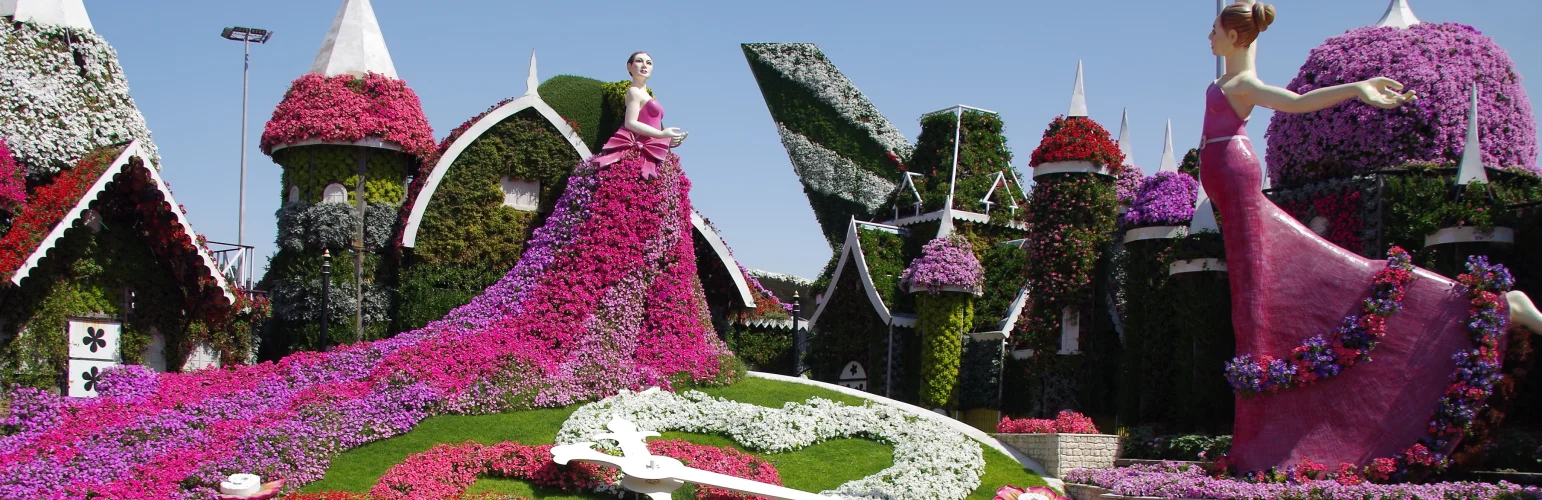 - В этом парке можно увидеть более чем 45 миллионов цветов, разных по форме, цвету и размеру. Здесь вы найдете не только обычные цветы, но и необычные растения, создающие фантастические композиции, фигуры и скульптуры. Все это находится на территории, расположенной в 4,5 километрах от центра Дубая.