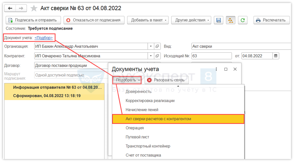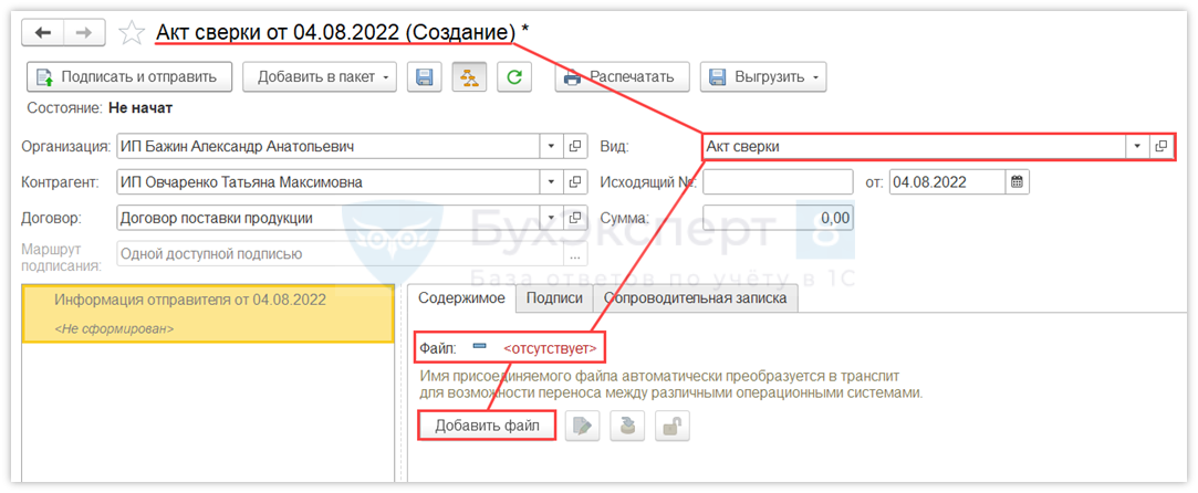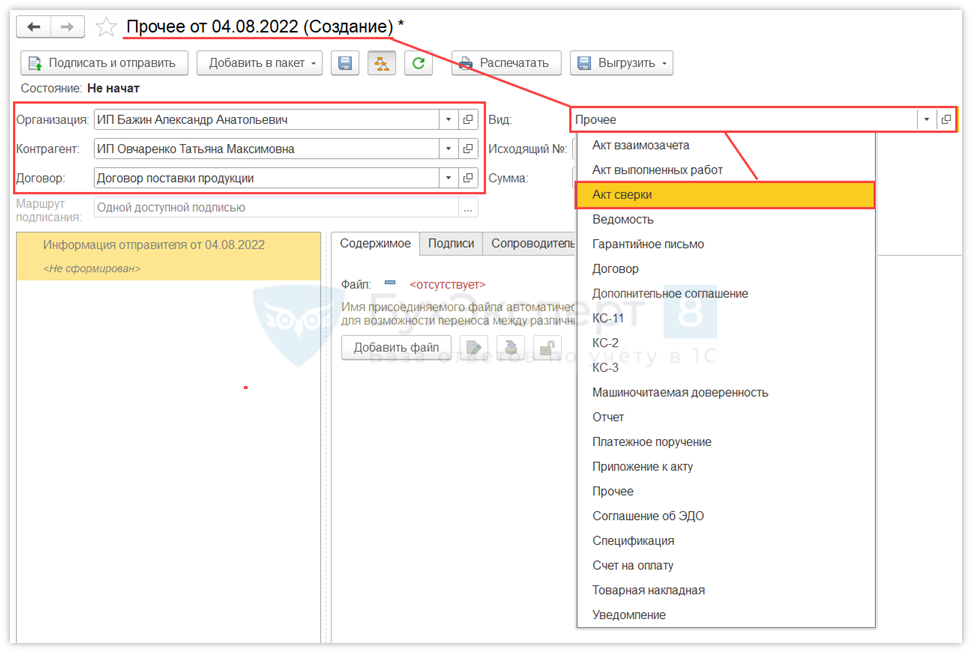 Заполните данные по организации, контрагенту и выберите Вид документа.