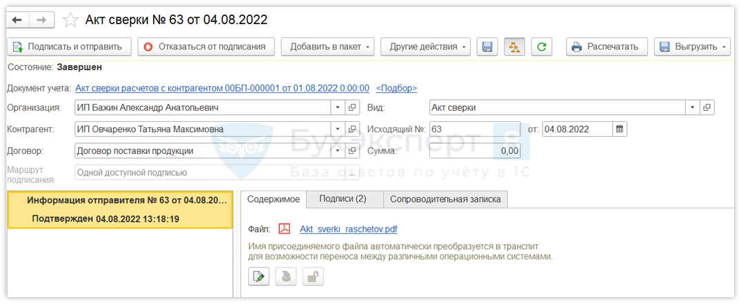 После одобрения контрагентом состояние произвольного документа ЭДО изменится на Завершен.