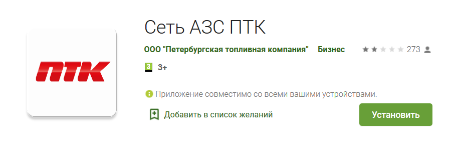Для скачивания программного обеспечения откройте магазин App Store, если вы являетесь обладателем гаджета на базе iOS, или запустите Play Market, если смартфон работает на Android. Далее необходимо выполнить поиск по словосочетанию «Сеть АЗС ПТК». Если сформировать запрос корректно, требуемое приложение окажется в самом верху выдачи. Его останется лишь загрузить в память устройства, и подождать, пока завершится автоматическая инсталляция.