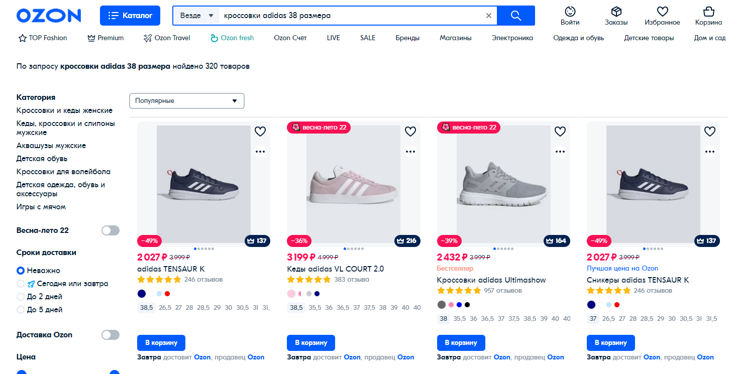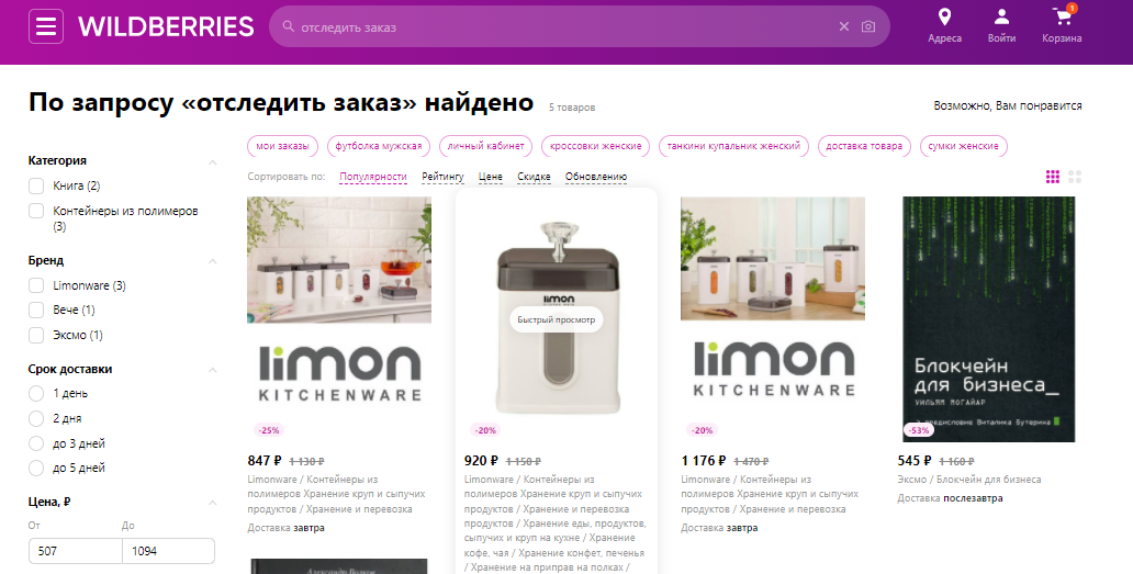 Из российских площадок, которые мы тестировали, только у Ozon и Lamoda частично настроен поиск непродуктовых запросов. Если ввести «возврат товара» или «пункты выдачи» на главной Ozon, сайт перенаправит в раздел справки. Но «доставка заказа» или «статус заказа» выдают нерелеватные страницы.