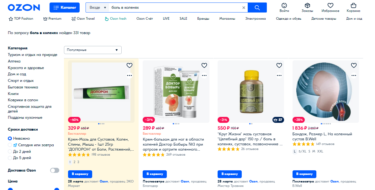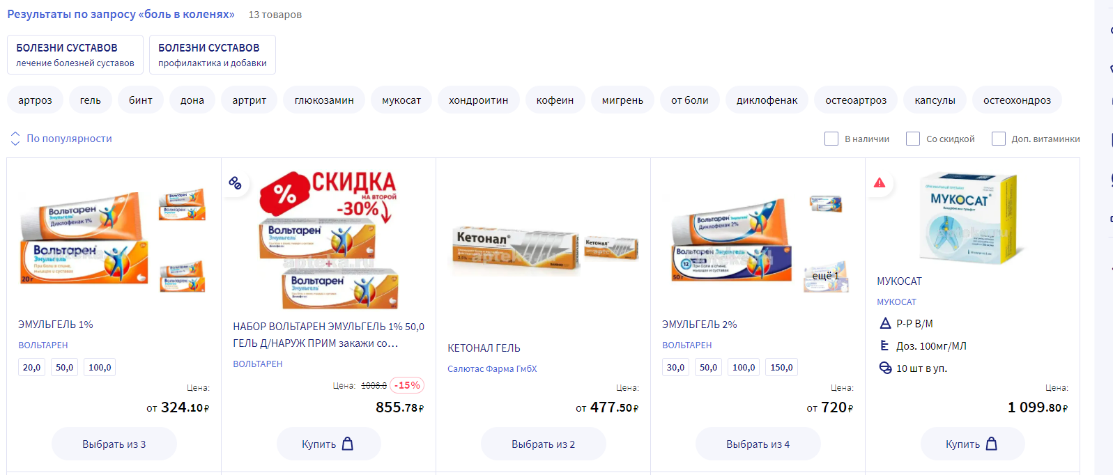 Поскольку запрос слишком широкий, обычно по нему выдается несколько товаров, что только сбивает пользователя с толку. Например, запрос «боль в коленях» на Ozon предлагает все: от бальзамов и масел до бандажей и тейпов. А крупнейшая российская фармацевтическая площадка Аптека.ру по этому запросу отображает только мази и не показывает ни бандажи, ни наколенники, ни обезболивающие средства.