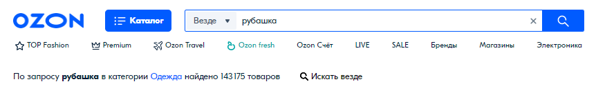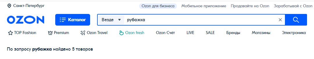 Часто пользователи копируют и вставляют название товара из внешних сайтов и социальных сетей. Так что вероятность ошибок есть всегда, особенно, орфографических, и площадкам нужно это учитывать. Например, Ozon не понял, что мы имеем в виду под словом «рубажка» и предложил пять позиций. Если написать слово правильно, товаров уже 143 000. Конечно, такая ошибка редкая и, скорее всего, пользователь сам ее заметит, но платформе лучше обеспечить максимальное удобство для покупателя, чтобы ему не приходилось переписывать слово.