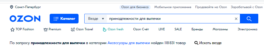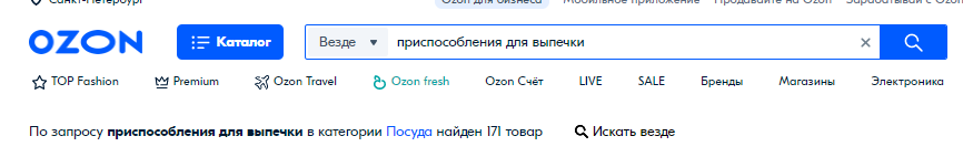 Иногда люди ищут товары, используя привычные им слова, а сайт их не понимает и показывает только часть результатов. Это касается альтернативных названий, синонимов, диалектов. Например, на Ozon у запроса «приспособления для выпечки» доступен 171 вариант, а у «принадлежностей для выпечки» — 118 000.