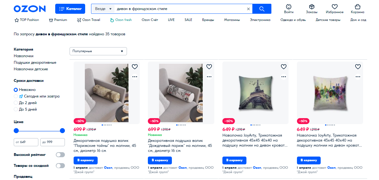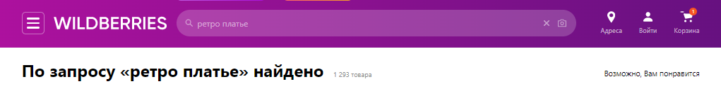 В исследовании Baymard University 46% сайтов не смогли обработать поиск по тематике, если она не указана в названии товара. В нашем тестировании поиск дивана во французском стиле тоже не увенчался успехом на Ozon, а на Wildberries мы нашли всего тысячу платьев в ретро-стиле, и многие позиции были неподходящие.